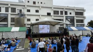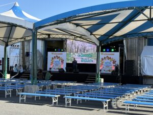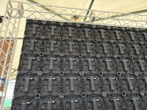 幅4m 高3m 200インチのサイズでステージ後のトラスから吊り下げで設営しました。(写真データは2025年8月2日(土)15時頃の映像)
