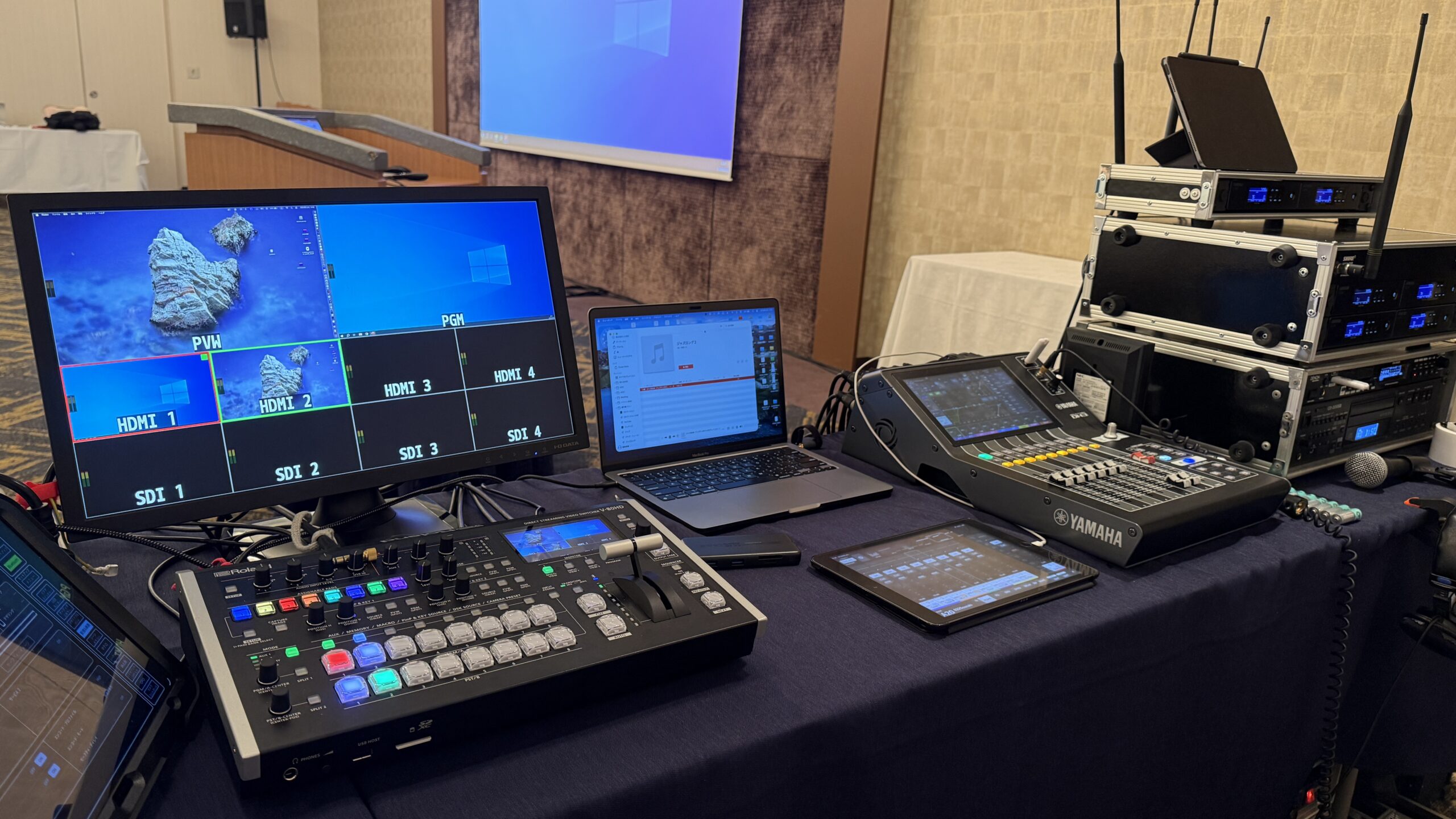 会議や講演会など6~7 面モニターを使い各種データを見比べながら行う会議や講演会データ分配のサポート